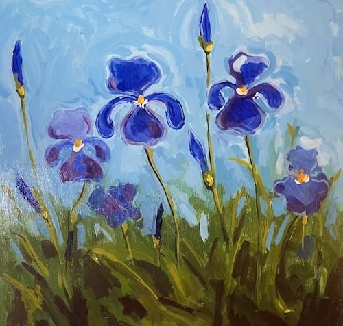The entire staff is waiting for her when she reaches the front desk. Standing together behind the desk, they congratulate her on her achievement and wish her the best of luck. Reaching over the desk the Admin hands her a diploma of completion, along with it’s jumbo envelope, and signed by all of them. Deborah is surprised. Speechless, really. For weeks, she has come and gone in this clinic as though in a trance. The staff has been nothing but kind and competent, and yet she has not really stopped to look at them, let alone to wonder about them, or to get to know them. Yet here they all are, come alive. Real people. It’s as though she is seeing them for the first time. They hand her a gift bag. She looks into the bag and sees white tissue paper, and nestled within—the edge of a canvas. She takes the painting out of the bag. It’s an original acrylic of iris. Each brush stroke is piled with color and vigorous life. They explain that the gift is from an artist who is part of a volunteer program that donates original art to be given to breast cancer patients when they complete treatment. Deborah holds the painting to her chest, “Thank you. Thank you to all of you for your kindness. And would you thank the artist for me?” She looks at the signature. Would you thank for me? Deborah has not seen this coming, caught off guard, she is at a loss for words. The painting is a true gift. The nature of a true gift is that it is both unanticipated by the receiver and unintended by the giver. The staff does not know that Deborah is an artist, let alone that she draws secret powers from her relationship with her mother, who was also an artist. They could not know how meaningful and precious is their gift to her. Deborah decides, on the spot, that she will donate a gift of hand-painted yarn along with a shawl pattern, because some of her fellow radiation graduates are bound to be knitters.