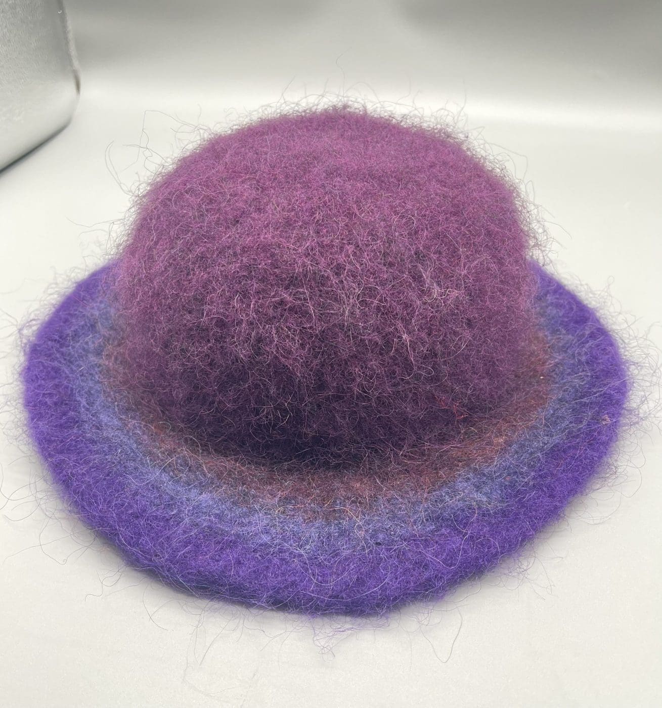 The body of the hat is knitted in shades of purple. The bottom of the crown is above the ears, therefore it will not keep your ears warm—but you will be hot whether you be in church or bar-hopping.