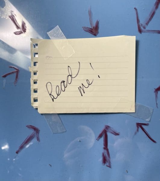 And the water does feel heavenly. When at last she gets out of the shower she slips into her thickest of bathrobes and wraps it tightly about herself. Towel drying her short hair she glances into the steamy vanity mirror. She sees it. A note is taped to the mirror, with arrows drawn in lipstick pointing to it. A shiver begins at her neck and runs down her back. She steps back, as though it is a nest of black widow spiders or a tear in the cosmos that is taped to her mirror. She waits a few minutes, breathing deeply. Then steps forward and leans toward the note. “Read me” is written in black sharpie. It's her own handwriting!