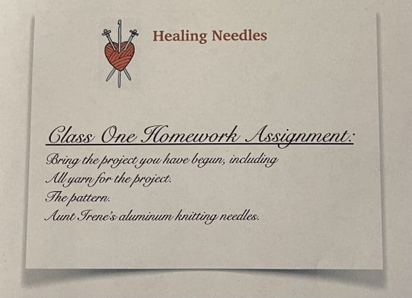 Deborah speaks first, “I’ll look forward to seeing you on Wednesday. Would you please bring your Alaskan sweater project, including all of the yarn, needles and the pattern? Bring everything you are using for that project. Also bring all of your Aunt Irene’s aluminum needles. I”m going to write that down so you remember.” Again, from the bag, Deborah pulls out a custom notepad. She writes a few lines in list format then hands it to Irene, who accepts the list and reads it.