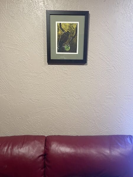 When he first stepped into this room, his mind immediately and reflexively analyzed geometric spaces. He noted the subtle square shapes in the carpet. His eyes traveled the carpet, across the room to a rectangular block of space against the back wall. He noted the couch was burgundy and the only solid color in the room. Above it hung a picture that was almost—but not quite—centered above the couch. He trained his vision on the picture as he walked into the room. He planted his feet hard as he walked, forcing them to disregard the carpet patterns and walk in a straight line. As he moved closer to the couch he could make out that it was a raven in the picture. The raven roosted in a dark wood. Behind it were swirls of northern light green. More than anything—with every fast and slow twitch muscle of his body—he wanted to stride across the room and push the off-centered couch two inches to the right. But instead he joined the raven in the dark wood. What is the raven clutching with his foot? Some sort of glowing object. I bet it’s a raven’s treasure, he thought. Then in the back of his awareness, from a far away cave hidden behind an alder brush of neurons he heard a voice. It was Dr Waldt, “Please, have a seat,” he said, motioning them to his burgundy couch. Pete steadfastly kept his eye on the raven’s treasure as he made his way across the room. He was aware that Cindy, his wife, followed along behind him as he walked to the couch while simultaneously avoiding stepping on the subtle lines in the carpet. She has my back. Without having to turn to watch her, he already knew, Cindy stepped where she damn well pleased. She allowed her feet to have their way with the carpet. Rolling the dice, stepping on lines, between lines, and in spaces. Wherever the hell her luck and fate dictated. Oh how I love her. He stopped at the couch, turned first toward Cindy. She gave him what he called her be brave smile. Then he turned the remainder of the way and made eye contact with Dr. Waldt. “Please, have a seat,” Dr Waldt said as he, himself, sat down across from them in a black leather rocking chair. Pete and Cindy sat down simultaneously. His legs too long for the couch, lifted off of the cushions at the knee and eventually met up with his seated backside.